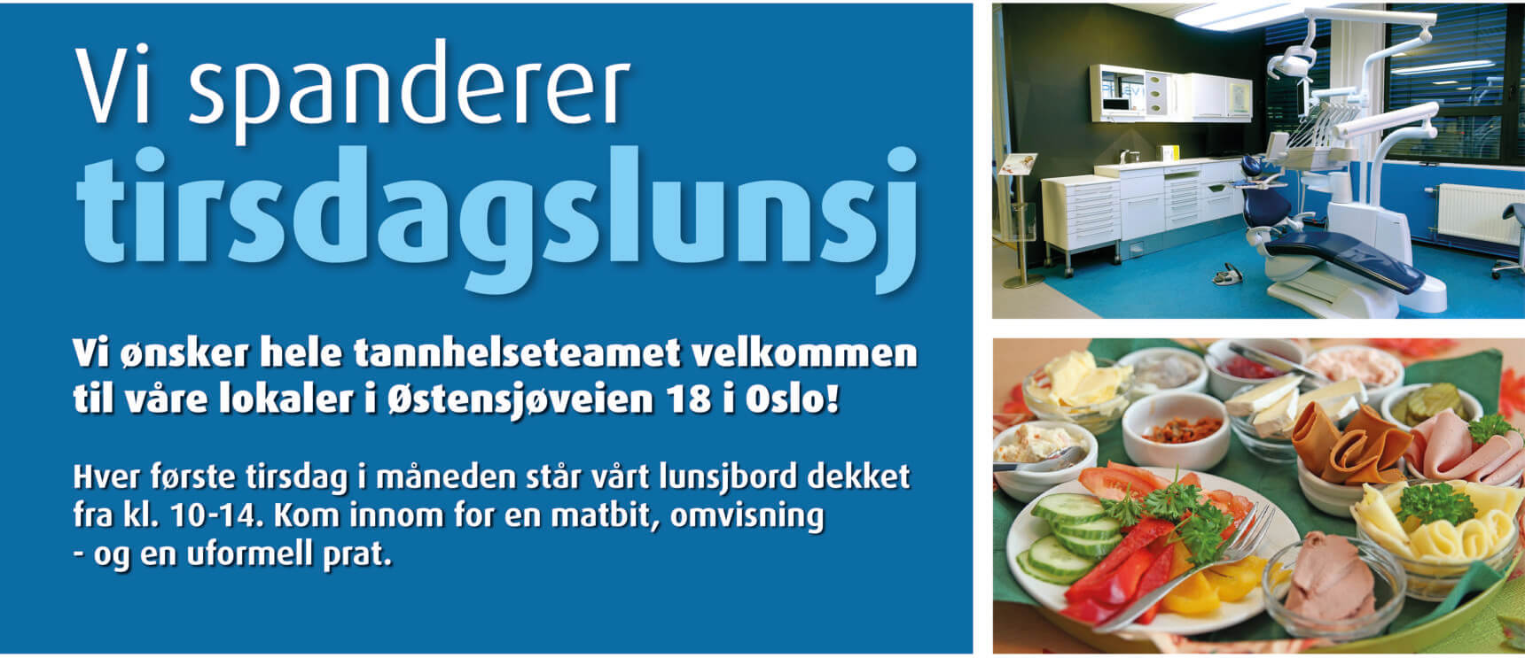 Vi spanderer Tirsdagslunsj på hele tannhelse-teamet i våre lokaler i Oslo. Hver første tirsdag i måneden mellom kl.10.00-14.00 står lunsjbordet...