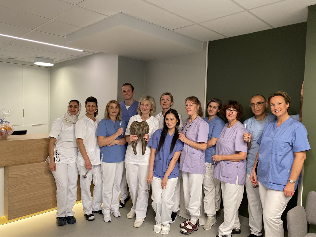 Vi i Dental Sør takket for et flott samarbeide med denne siste klinikken i Akershus ved overrekke en keramikktann fra Torunns Keramikk. Vi har levert utstyr som skal vare, derfor også en gave som skal vare minst like lenge. Men nye uniter fra Heka, røntgenutstyr fra Kavo, innredning fra Climo, belysning fra D-Tec og masse annet ønsker vi de ansatte hjertelig til lykke med Norges «hittil» flotteste klinikk. Hittil for de den neste skal etter vår målsetning alltid bli bedre en den forrige, men etter denne klinikken blir det en utfordring i 2020!